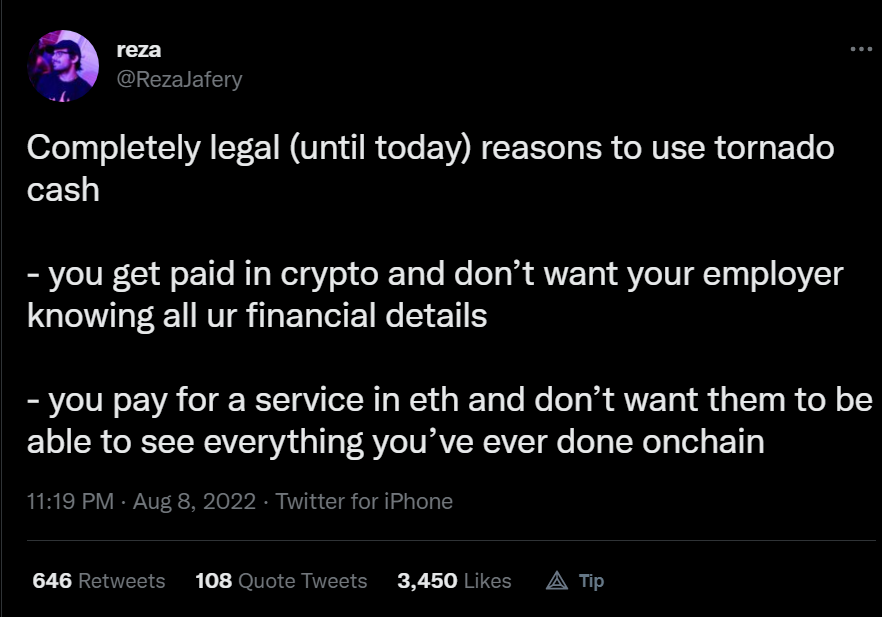 إذا كان هذا السيناريو الإفتراضي يبدو مألوفاً ، فهو يستند إلى تغريدة من مؤسس شركة الإيثريوم فيتاليك بوتيرين ، تم نشرها بعد أن عاقبت وزارة الخزانة Tornado Cash .